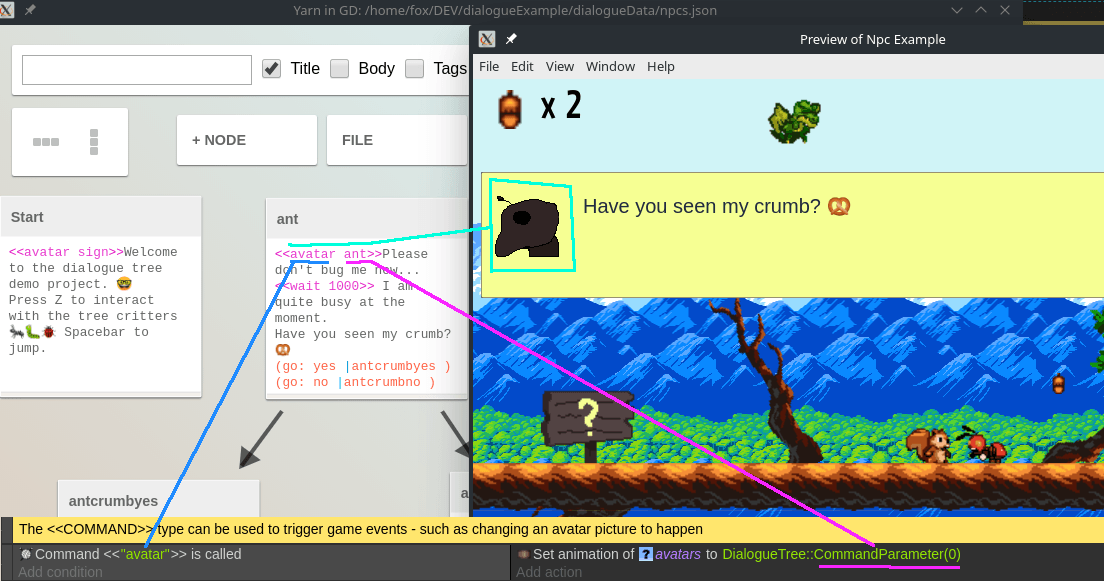 • Set reusable commands to be triggered by Yarn - such as changing of avatars, playing of sound effects and any other game events to help tell your story.