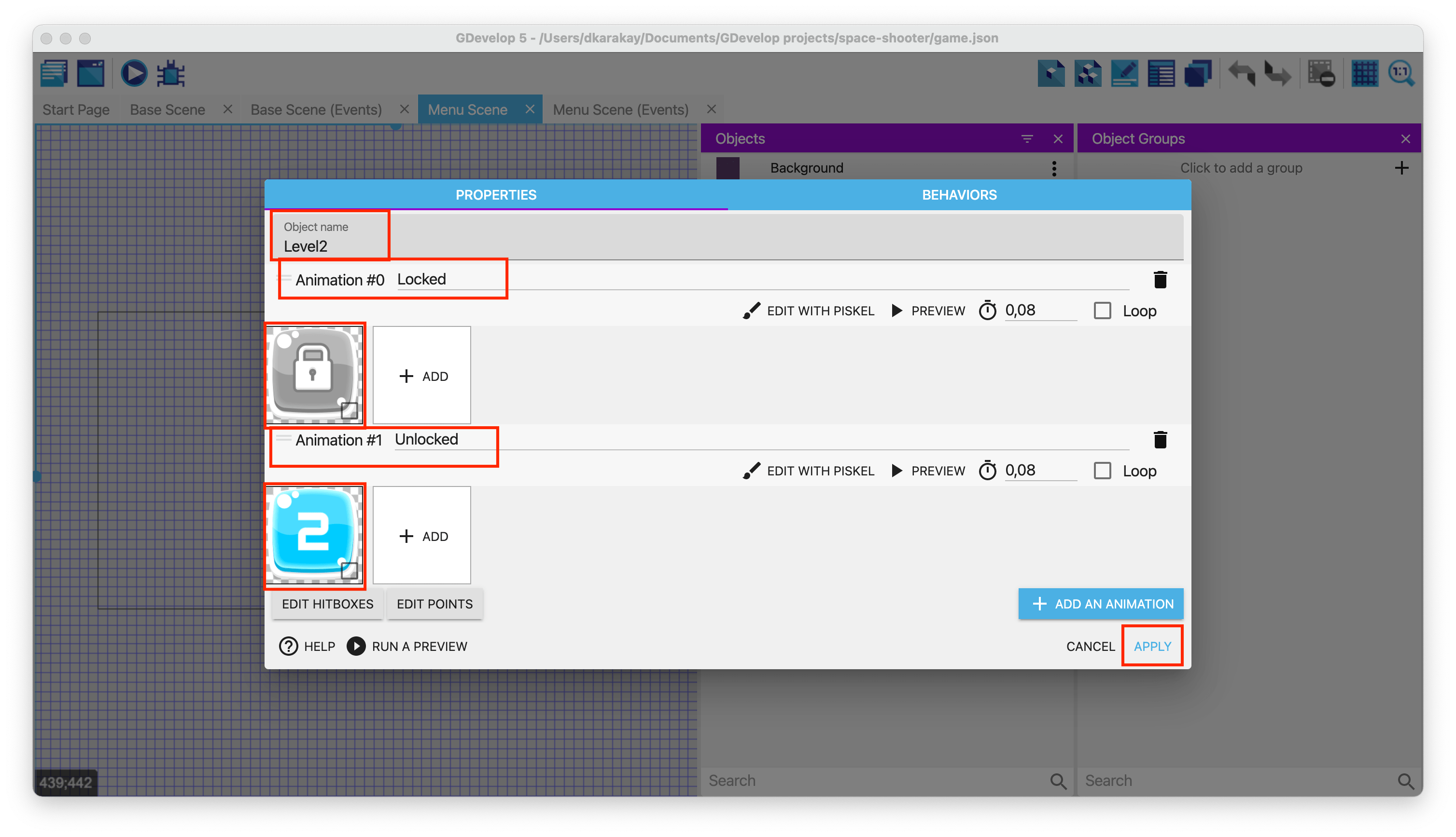 Add a new object called Level2 select the image button_locked.png from the assets folder. Set the animation name to "Locked". To create a new animation, select the image button_level_2.png, and use "Unlocked" in the name field.